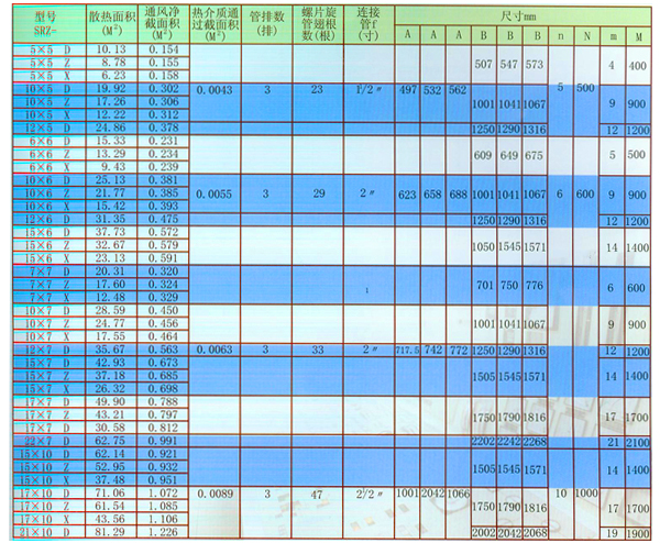 散熱器的翅片管均用中21×21nm尤縫鋼管繞制—1215×、0.5mm皺折鋼帶而成,呈螺旋狀,其中片距:有5mm—大“D”,6mm—中“Z”,8mm-小“X”,三種共有三十八種規(guī)格。
