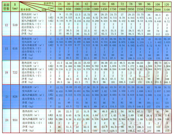 如采用兩排,片距為3.2mm,表面管數為2l,管長為60英寸,