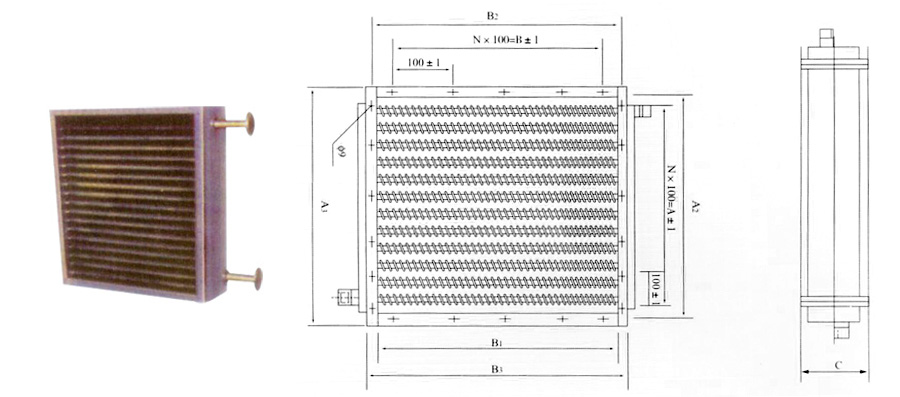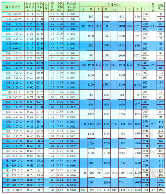 SRL型散熱器共有37種,該散熱器是應用鋼管鋁翅片管束組成,故鋁片與鋼管接觸緊密,散熱性能好、使用可靠。 SRL型散熱器以蒸汽或過熱水為媒,蒸汽壓力高為16Kg/cm,過熱水溫度為130℃,適用于空氣調節系統及干燥室內的空氣加熱。 SRL型散熱器在順氣流方向分二排管與三排管排列,其型號舉例如下: SRL型散熱器-5×5/2--順氣流方向二排管交叉排列: SRL型散熱器-5×5/3--順氣流方向三排管交叉排列。
